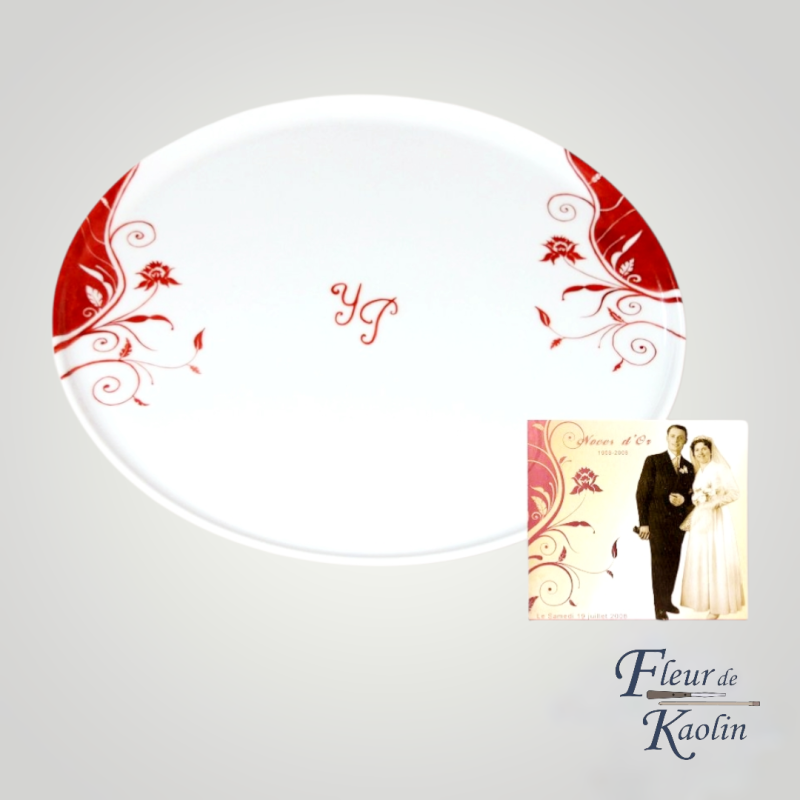 Décor peint à la main sur un plat en porcelaine, à partir du carton d'invitation.