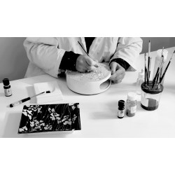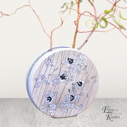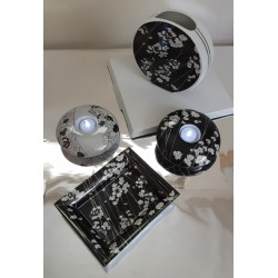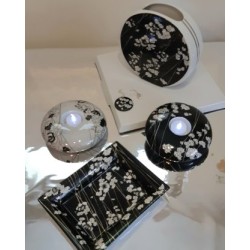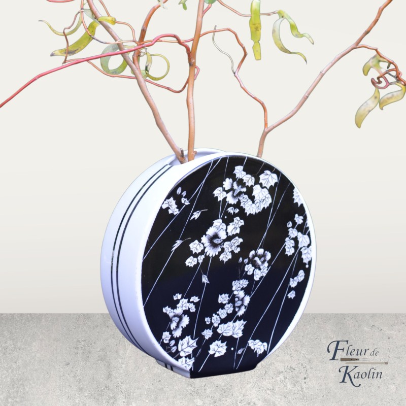 Vase à deux cotés, un coté noir, un coté topaze avec des feuilles japonisantes, les nervures des feuilles en platine, le vent, la neige en relief blanc.