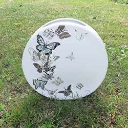 Les fleur de néuphars sont peintes en technique traditionnelle, les feuilles en lustre métallisé pour le coté nacré et entouré d'un liseré en relief blanc. Le fond est peint en technique américaine pour garder le coté pastel. le bord est peint en platine puis des dessins sont dessinés en relief.