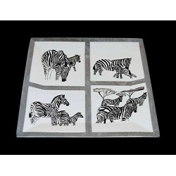 Inspirée de photographies, cette œuvre propose une mise en lumière du zèbre, icône graphique de la savane africaine. La composition est subtilement structurée en quatre scènes, séparées par des bandes gris marbré.