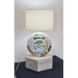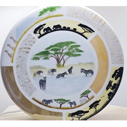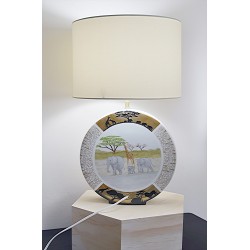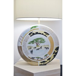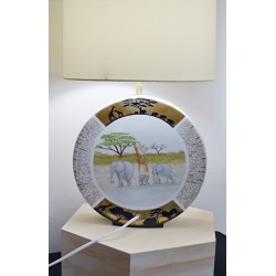 Pied de Lampe en porcelaine sur le thème de la savane africaine, avec une approche mêlant techniques traditionnelles et modernes. L’idée d’un décor panoramique, avec une face représentant les animaux au bord d’une mare et l’autre des éléphants et girafes en promenade, donne un effet immersif et vivant.