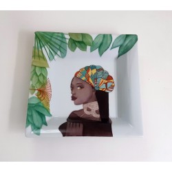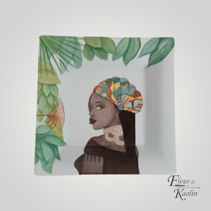 Peindre une femme africaine en tissu traditionnel sur porcelaine permet d’avoir une œuvre vibrante et pleine de caractère. La femme, élégante et gracieuse, dans une attitude sereine et noble, avec ce tissu africain aux couleurs vives dans les cheveux.