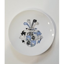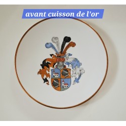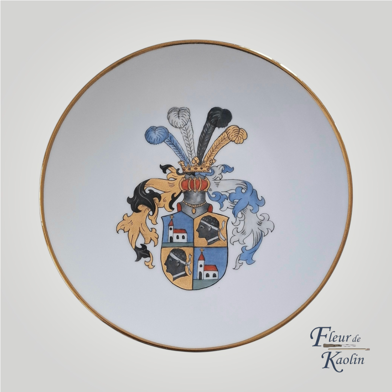 Le concept consiste à reproduire un écusson sur une assiette en porcelaine, sublimé par une touche d’or brillant.