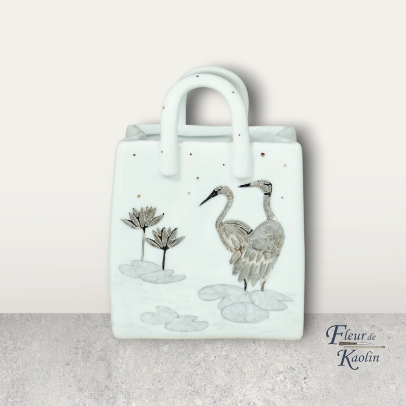 Ajoutez une touche d’élégance à votre espace bureau ou beauté avec ce pot unique, orné d’une aigrette et d’un nénuphar dessinés à la main en platine, sur un sac en porcelaine. Parfait pour organiser vos pinceaux et accessoires avec style.