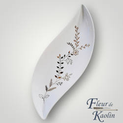 Ces petits supports en porcelaine sont décorés à la main de feuilles et de branchages en or et en argent. Chaque pièce est cuite plusieurs fois à 820 degrés, un procédé qui permet au décor de fusionner avec la matière et de devenir inaltérable.