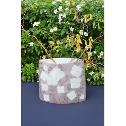 Ce vase unique avec des reflets grâce à un travail minutieux du lustre blanc, offrant un effet nacré raffiné. Les feuilles et les fleurs, délicatement réalisées avec cette technique, captent la lumière et apportent une touche de douceur et de sophistication.