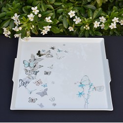 Ce plateau carré en porcelaine Haviland est orné de papillons délicatement peints à la main, sublimés par des techniques de lustre ou métaux précieux qui leur confère un éclat nacré unique.