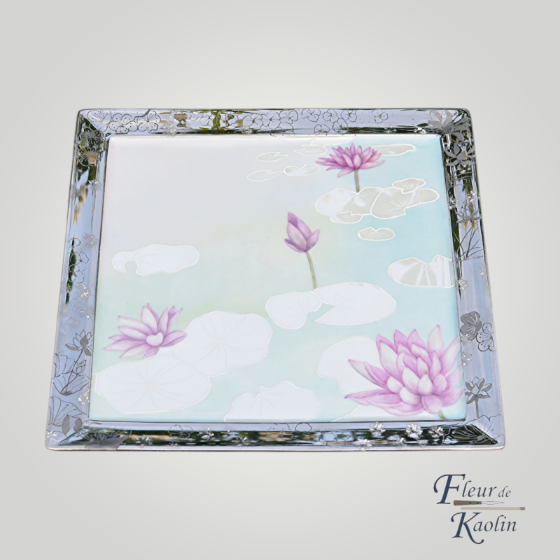 Le contour est peint en argent et orné de motifs délicats réalisés à la plume, reprenant le thème des nénuphars.