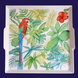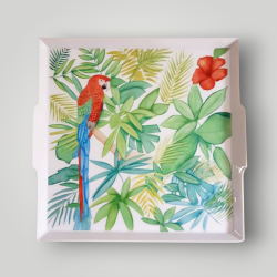 Représentant un Ara au cœur de sa forêt tropicale, ce plateau allie utilité et esthétique.