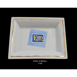 un vide-poche en porcelaine, décoré des initiales en or des mariés et un liseré en or brillant.