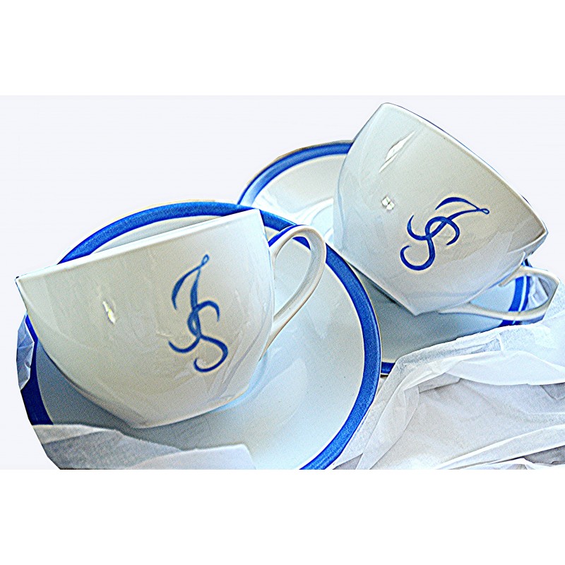 Décor peint à la main sur des tasses, à partir du carton d'invitation.