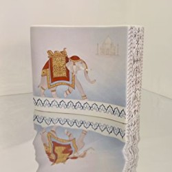 Cette peinture unique met en scène un éléphant noble avec le Taj Mahal en arrière-plan, accompagné d’une ribambelle d’éléphants décorés de tapis colorés en relief blanc. Les motifs sont sublimés par des décors délicats et des bandes en or, ajoutant éclat et sophistication.